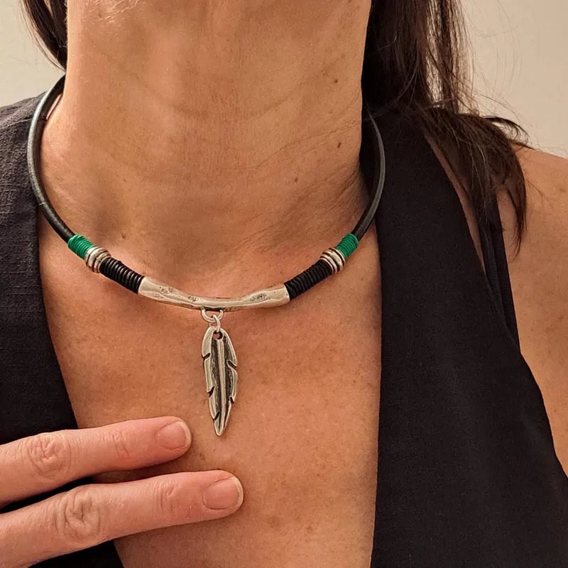 Materiales como cuero, zamak plateado, madera, resina e hilos naturales se combinan para dar forma a piezas únicas, donde cada textura aporta personalidad.