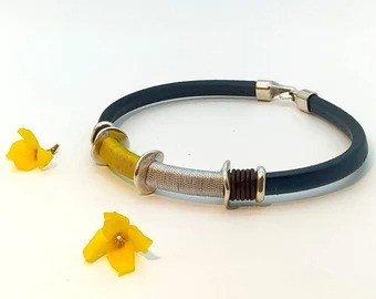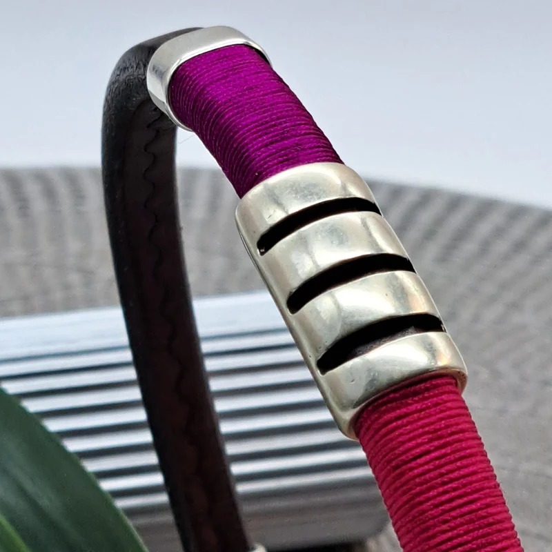 Trabajo con materiales como cuero, zamak plateado, madera, resina e hilos naturales, seleccionados por su calidad, textura y durabilidad. Cada material aporta carácter y personalidad a la pieza final.
